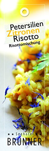 Zutaten: Risottoreis, Karotten, Zitronenschale 5%, Zwiebeln, Petersilie 2,5%, Selleriestengel, Kurkuma, Kornblumenblütenblätter. Kann Spuren von Nüssen, Ei, Senf, Sesam, Soja, Milch, Gluten enthalten. 100 g enthalten durchschnittlich: Energie: 1374 kj / 328 kcal Fett: 0,7 g – davon gesättigte Fettsäuren: 0,2 g Kohlenhydrate: 71,9 g – davon Zucker: 2,3 g Eiweiß: 7,5 g Salz: <0,1 g Ballaststoffe: 2,7 g